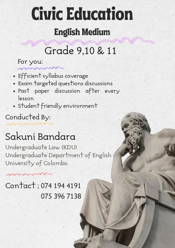As an undergraduate of the University of Colombo Faculty of Arts and a first-year law student with a strong academic background in Political Science and Civic Education, I am well positioned to guide students in mastering the subject effectively. My approach to teaching will be primarily examination-oriented, focusing on clear explanation of key concepts, structured note-giving, and systematic coverage of the syllabus in line with examination requirements. I will also emphasize answer-writing techniques, model questions, and past paper discussions to help students develop confidence and achieve higher grades. At the same time, I aim to cultivate a practical understanding of civic responsibility and citizenship so that students not only succeed in examinations but also appreciate the real-world relevance of the subject.