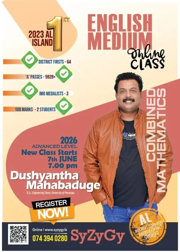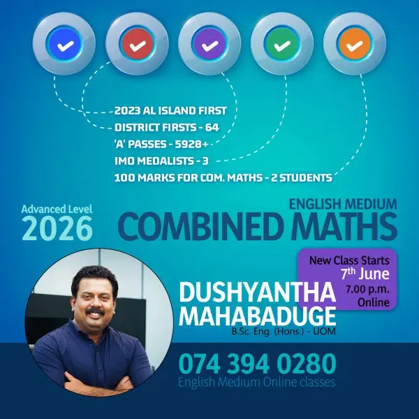 Engineer Dushyantha Mahabaduge, 24 -years brand in Combined Mathematics, who has touched the highest number of A passes (over 5928) and the most district first (64) in Sri Lanka, produced 3 International Mathematics Olympiad medalists, one Island first and two times 100% marks Combined Mathematics.