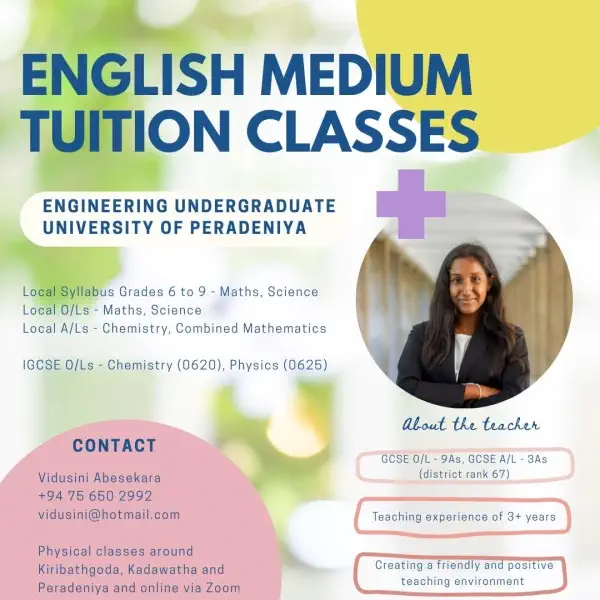 I am an Engineering Undergraduate at the University of Peradeniya, currently studying as a second year. Ive completed my GCSE O/Ls with 9As and Advanced Levels with 3As (Chemistry, Combined Mathematics, Physics). The start of my teaching career was during my A/Ls where I got the opportunity to teach O/L students from school. Ive been passionately teaching since then. I am a firm believer that the teaching environment must be friendly to the student to clearly express the areas that he/she needs more support and clarifications in.