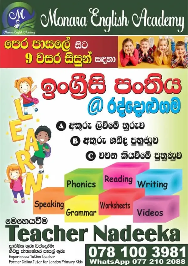 Classes are conducted at following location(s)Teacher would visit students' homes in following locationsGampaha District, Sri LankaEkala Online ClassesClasses are conducted online (Or educational material available online). You can join the class (or read educational material) from anywhere in the world.