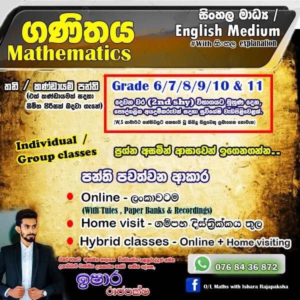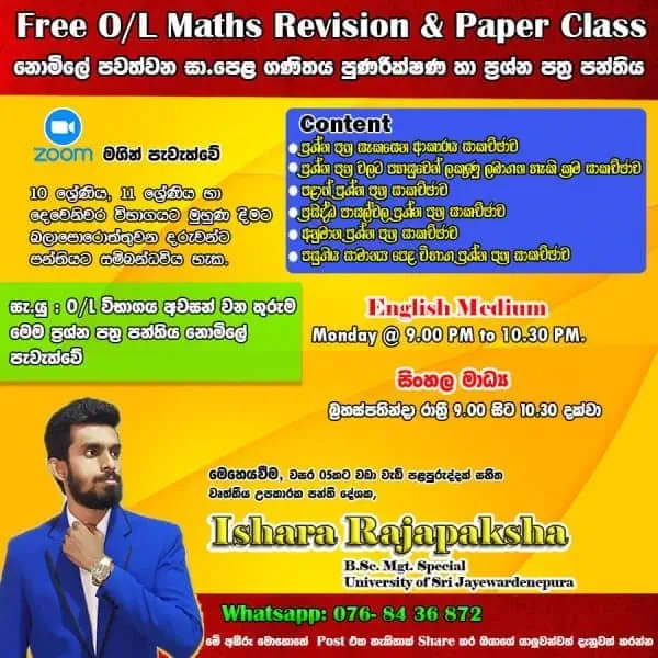 📌️මෙවර O/L විභාගයට මුහුණ දෙන දරුවන් සදහා 2026 ජනවාරි ගණිතය ප්‍රශ්න පත්‍රයට නිසැකව එන කොටස් වලට වැඩි අවදානයක් යොමු කරමින් අවසන් මාස කිහිපය තුල ඉහලම ප්‍රතිඵලයකට යා හැකි ප්‍රශ්න පත්‍ර සමග Theory කරුණු යලි මතක් කරමින් සිදු කරන ශීඝ්‍ර පුණරීක්ෂණ පන්ති පැවැත්වේ.