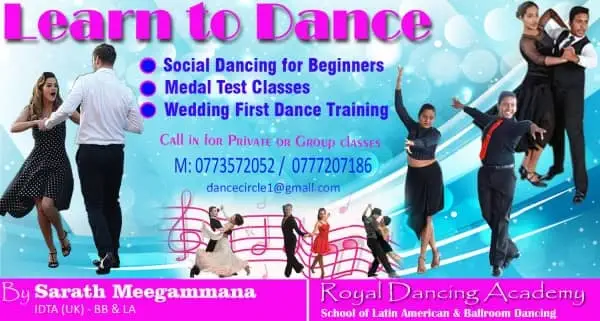 We do Latin American & Ballroom Social Dancing classes for beginners, Medal Tests (Bronze, Silver, Gold) / Wedding first Dance for bridal Couples / Private Social Dance lessons / Free Style Bollywood Dance class for Ladies / Kandyan Dance Classes for Kids over 5 years and others / Do choreography for Groups to dance in their Weddings , Parties and Company events. Talk to us for more info on 0773572052 or 0777 207186
