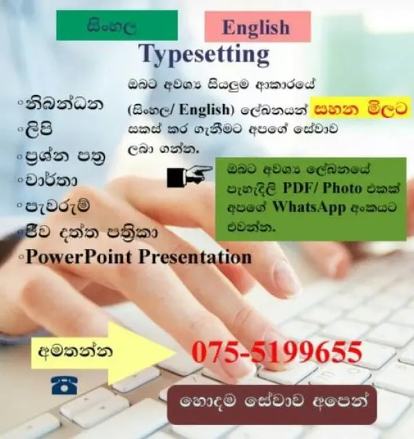 ඔබගේ උපකාර පන්තියට අදාල සිංහල, ඉංග්රීසි ටියුට්, පේපර්ස් හෝ අනෙකුත් සියලුම ටයිප් සෙටින් සාධාරණ මිල ගණන් යටතේ ඔබට අවශ්ය ලෙස word, excel, pdf හේ photo ලෙස ලබා ගැනීමට දැන්ම අමතන්න.