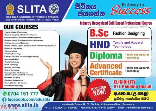 SLITA will provide fast track and cutting edge education to professionals for managing the Apparel Industry in a competitive era. The institute has entered into Memorandum of Understanding leading Industries (MOU) such as North Carolina State University, Bunka Fashion College, Japan. SLITA is committed to prepare its students for technical and managerial positions in Textile and Apparel Industry and strive to deliver quality education through a system of effective pedagogy and continuous industry interaction with students. With synergy of new technology and the knowledge from the industry, Institute mandate is to create of technical and management professional who can understand the dynamics of global business environment for Textile & Apparel Industry.