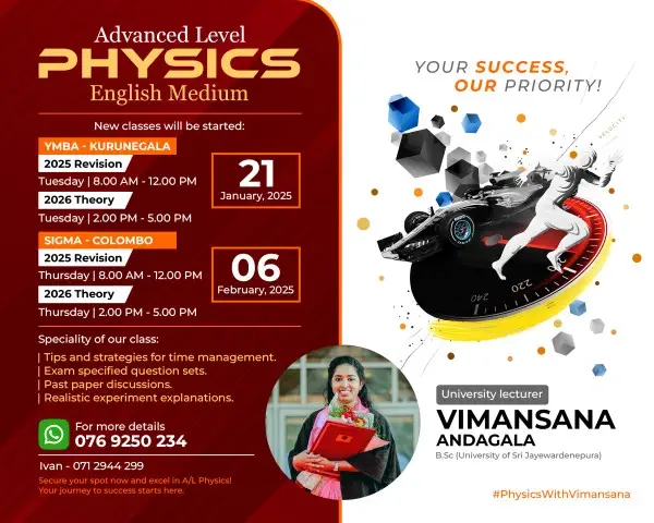My teaching emphasizes exam techniques, proven successful for over 6 years. I offer online individual classes with a physical-class feel. Hourly rate: 1000 LKR (negotiable for group sessions).