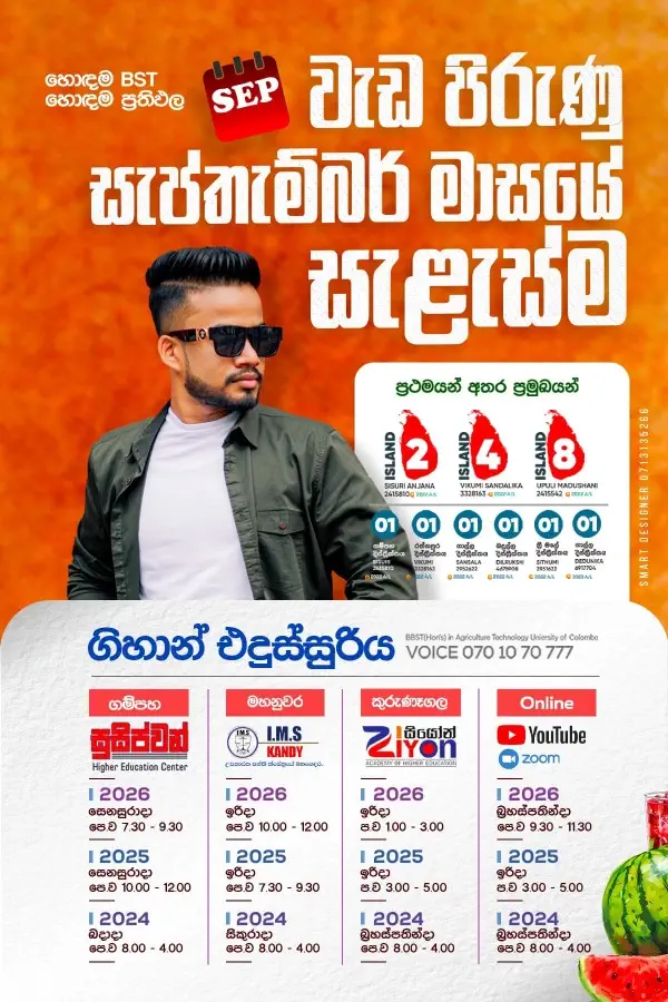 ගුරුවරයා/ගුරුවරිය විසින් පහත සඳහන් ආයතන/ස්ථානයන්හි පන්ති පවත්වනු ලබයිකුරුණෑගල දිස්ත්රික්කය, ශ්රී ලංකාවකුරුණෑගල ගම්පහ දිස්ත්රික්කය, ශ්රී ලංකාවගම්පහ නුවර දිස්ත්රික්කය, ශ්රී ලංකාවමහනුවර මාර්ගගත පන්තිමාර්ගගත පන්ති පවත්වනු ලබයි. ඔබට ලෝකයේ ඕනෑම තැනක සිට පන්ති හා සම්බන්ධ විය හැක.