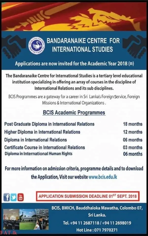 The Bandaranaike Centre for International Studies is a tertiary level education institution specializing in offering an array of courses in the discipline of International Relations and its sub disciplines.