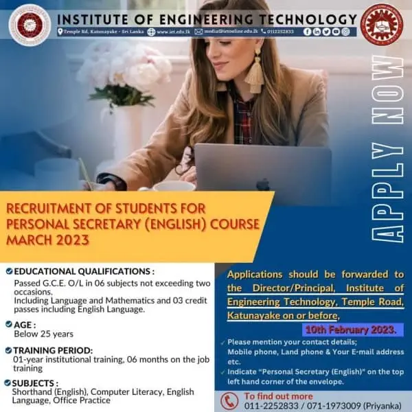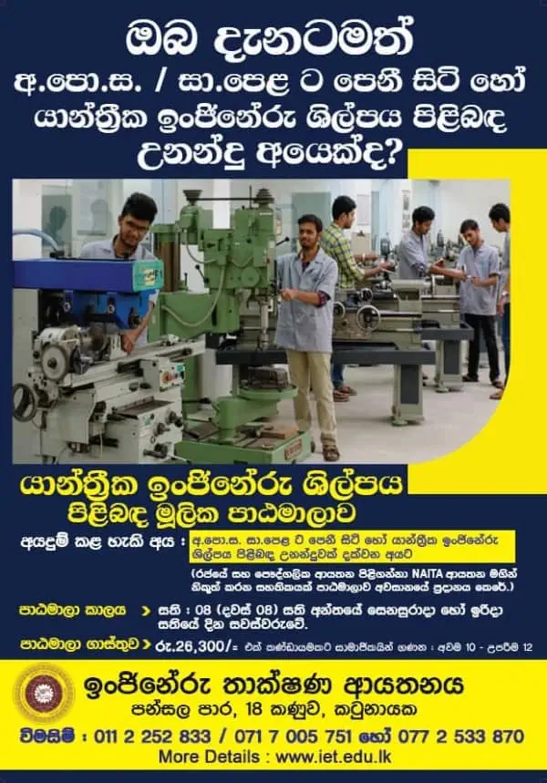 This is the only institute specifically established for training Middle Level Engineers in Sri Lanka which produce practical oriented engineering professionals in main Engineering discipline. IET awards the National Diploma in Engineering Sciences (NDES) which produces annually around 400 Engineering Diplomates to the Country.