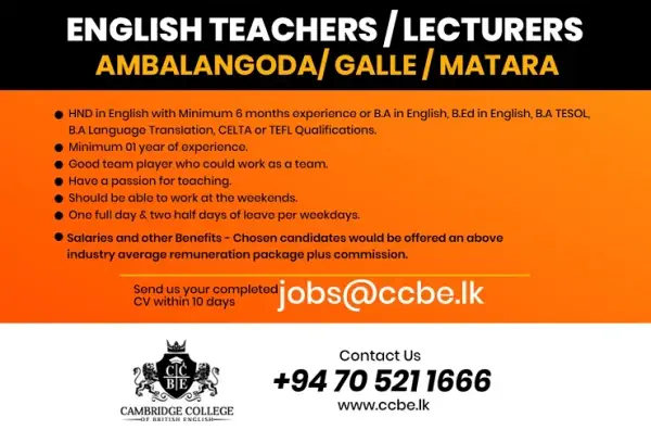 Vacancies For English Teachers / Lecturers - අම්බලන්ගොඩ / ගාල්ල / මාතර