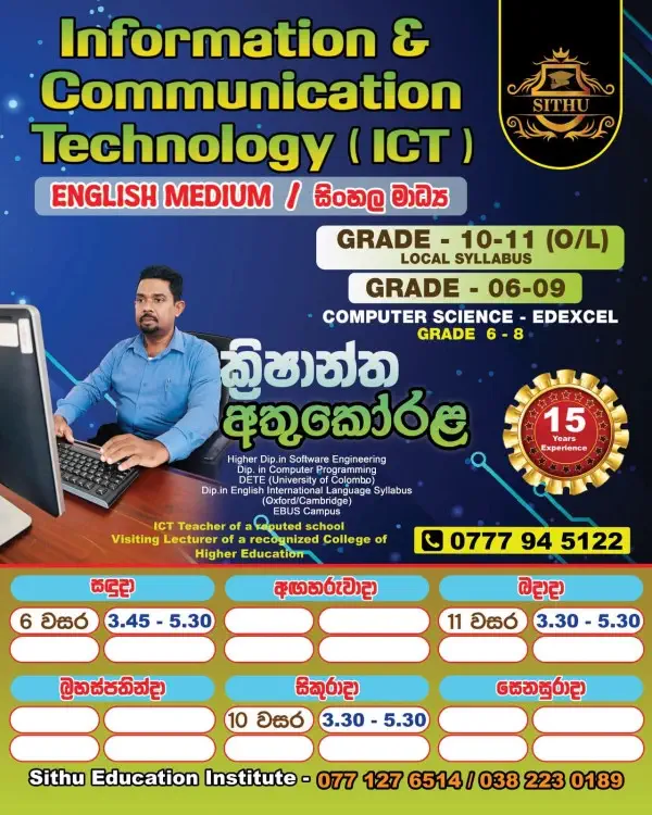 கற்பித்தல் அனுபவம் : 15 வருடத்திற்கு மேல்